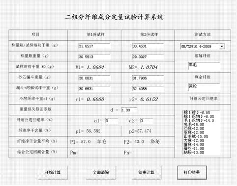 (b) 图2 安装完成后的二组分纤维成分计算结果显示 在实际操作过程中,根据标准或客户要求,有的二组分实验报告只需要净干含量,不需要计算结合公定回潮率含量,这时纤维的公定回潮率值输入0,本文中采用If then.. ..Else.. ..End if语句实现净干含量和结合公定回潮含量的分开计算。计算结果如图3所示,当输入的公定回潮率为0时,结合公定回潮率栏中的数值是空值。 图3 二组分纤维净干含量计算结果界面 3.2打印功能 当输入二组分纤维试验数据并计算得出结果后,点击“打印结果”按钮。输出打印结果如图4所示,打印结果如实反映了原始测试数据和计算结果,因此打印文本可以当作为客户出具检测报告中的原始数据记录部分。 图4 二组分纤维成分计算软件打印结果按钮操作效果 3.3清除功能 当打印完毕后,需将输入的数据和计算得出的数据清空,点击“全部清除”按钮,清空结果如图5所示,除测试方法栏中的标准选项框未清空外,其它文本框和列表框中的数据均已经清空,清空后开始新的二组分纤维成分计算。但需要指出的是,按清除按钮后测试方法栏中的标准选项无法清空,所以使用者应注意重新选择测试方法,以免在打印报告时选择了错误的标准依据。