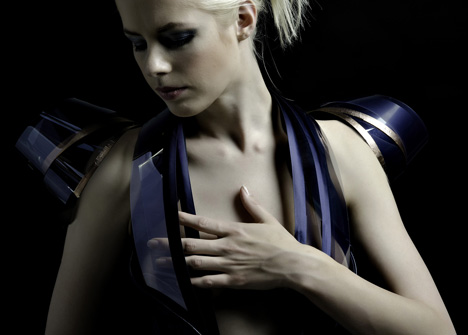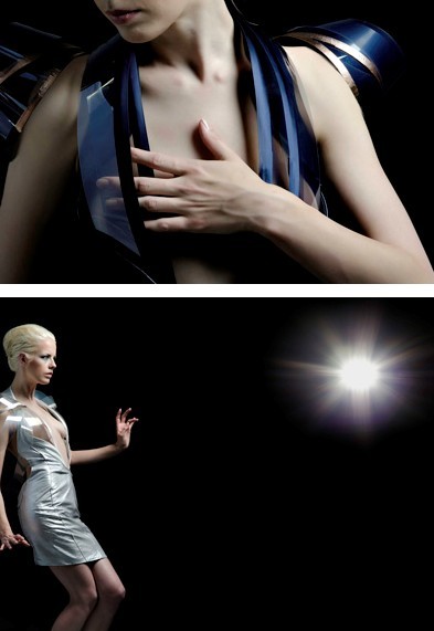 内文中还准备有视频――原来,这些衣服都内置有各种传感器,用来探测周围是否有人正看着自己,而一旦结果为真,它就会让自己像风儿吹动一般摇摆,并同时点亮蓝色的气氛光,让自己裙角飘飘似仙~ 设计:高英(音,Ying Gao) 2、一兴奋就会变透明的衣服 来自Studio Roosegaarde的创意,这款Intimacy 2.0是个极有情调的情趣高手,它能探测人的情绪,一旦穿着的人变得“兴奋”,它就能让自己变得透明……