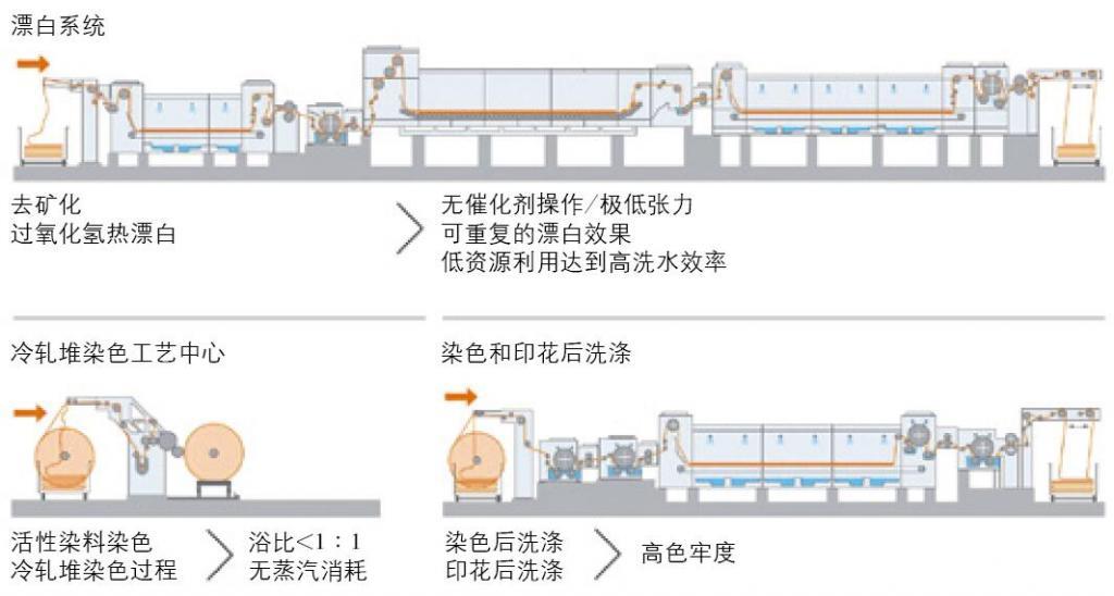 恒天立信旗下的高乐、瑞士Benninger(贝宁格)、德国欧宝泰克等公司的针织物平幅漂白、染色、水洗等生产线,既可提高效率,又能降低加工成本,有力促进了针织物平幅连续加工的技术进步。 泡沫染整技术 由于浴比小,泡沫染整技术可以大大节约用水,并显著降低各种助剂的用量,缩短加工时间。此外,常规染色织物带液率一般为60%~80%,泡沫染色织物带液率一般为10%~40%,从而可减少废水排放,降低对环境的影响。