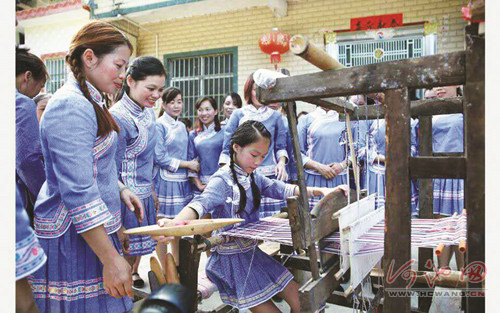 图为一名蓝衣壮少女在织布。
