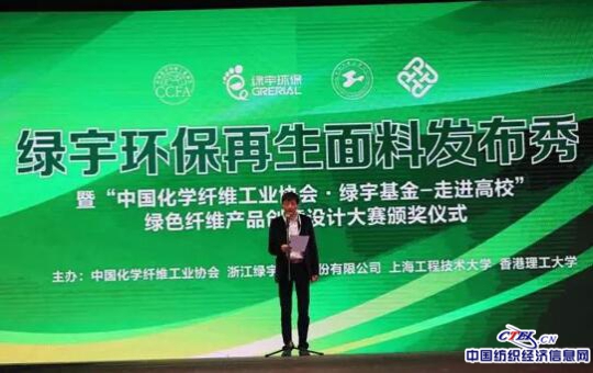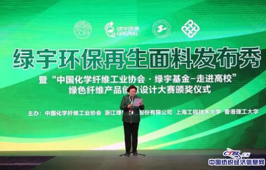 CTEI网讯 2017年3月16日,由中国化纤协会与浙江绿宇环保股份有限公司联合举办的“绿宇环保再生面料发布秀暨“中国化学纤维工业协会·绿宇基金-走进高校”绿色纤维产品创意设计大赛颁奖仪式”在国家会展中心(上海)召开。中国工程院院士蒋士成、中国化学纤维工业协会副会长贺燕丽、王玉萍,浙江绿宇环保股份有限公司董事长施建强、中国纺织科学研究院研究员赵庆章、法国时尚商会会长Marie_Laure SOUWEINE 女士、中国长丝织造协会秘书长黄潇瑾、上海工程技术大学服装学院党委书记袁蓉等领导出席发布会。化纤、纺纱、面料、家纺等产业链上下游企业和用户代表及媒体代表参加了发布会。 本次发布会上,浙江绿宇环保股份有限公司推出了再生环保面料。公司通过回收废旧纺织品,利用高温变革之路,分子有序的排列,制造出安全、高质化、环保的绿色纤维。在纺丝过程中采用原液着色技术,再生环保面料加工环节取消了印染工序,让纺织品的生命周期无限绿色循环。