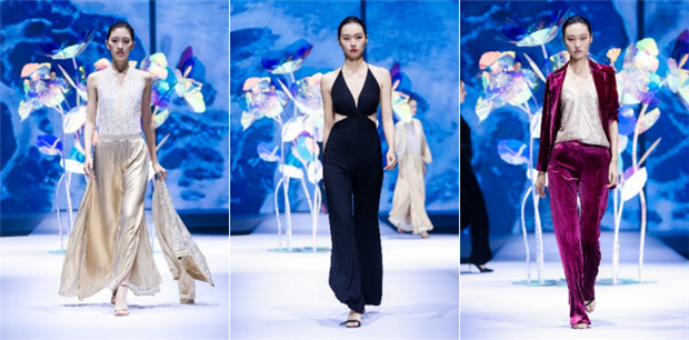Charlotta Gandolfo女士带来了“都市优雅·华丽轻盈”主题秀演,深受中国深厚的历史文化影响的她,对中国对丝绸以及代代相传的丝绸工艺情有独钟。本季与柯桥优选面料合作的时尚系列,设计师使用柔软而奢华的真丝面料配以纹样高雅的亮片来创作,将都市丽人轻盈若风的感觉与自然融合归一。