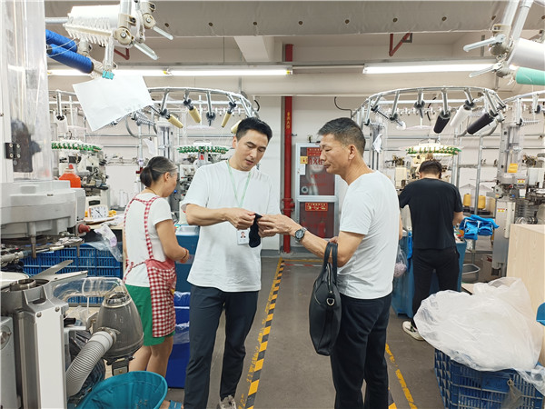 潘新明向商会工作人员展示车间正生产的袜子 潘新明说,这些袜子色彩主要有黄色、橙色、青色三种,色彩鲜艳又时尚漂亮,袜子上展现渐变色彩。亚运火炬手和工作人员的袜子颜色是一样的橙色,护跑手是黄色,志愿者是青色,这些袜子经过特殊后整理工艺,还具有功能性的亮点,都有排汗、透气、抗菌等功能特点,穿着柔软舒适。 记者问起为何能被361°选中做亚运袜? 潘新明说,为了紧跟361°的战略步伐,公司近年来加大技术改造升级,投入上千万元资金,购买了100多台一体袜机,不仅减少人工和生产环节,还大大提高了成品生产率,为公司迈向高端运动袜生产打下坚实基础。 潘新明表示,公司为亚运会生产20万专用袜,这是一次千载难逢的机会,我们传统袜企也能为亚运赛事做一点贡献, 对公司来说,它既是一种光荣,更值得我们自豪。