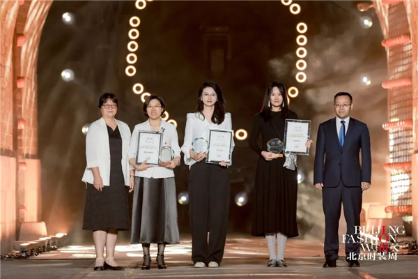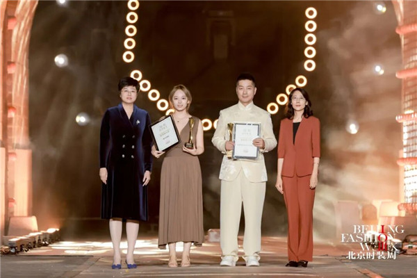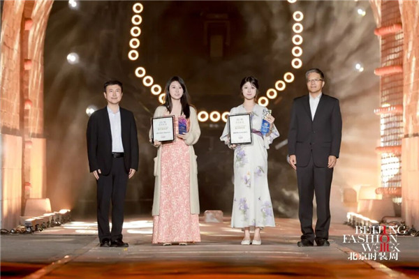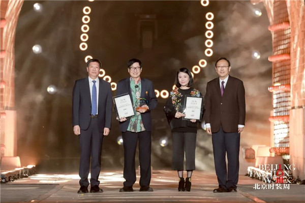 北京市商务局一级巡视员丁剑华(左一),北京时装周组委会主席团主席、北京时尚控股公司党委书记、董事长顾伟达(右一)为获奖者颁奖