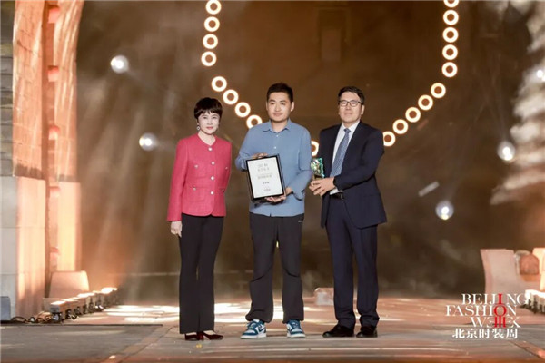 北京时尚控股公司党委副书记、董事、总经理刘常峰(左一),中国纺织工业联合会党委副书记朱超(右一)为获奖品牌颁奖