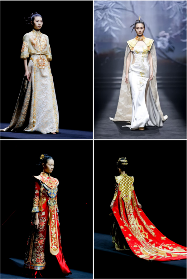 秀场上,非遗宋锦与苏绣技艺在经纬交错间编织浪漫叙事:赤玉红礼服上的盘金绣龙凤、花鸟纹样璀璨夺目,延续中式婚礼的祥瑞寓意;玉子、长春等灵力之色则勾勒出江南水乡的温婉,真丝罗缎与灵巧的打籽绣相映生辉。天玺突破传统形制,将彩帨、蔽膝等古典元素进行解构与重塑——一件红色敬酒服以收腰剪裁搭配可拆卸拖尾,既庄重亦实用,让仪式美学融入日常。