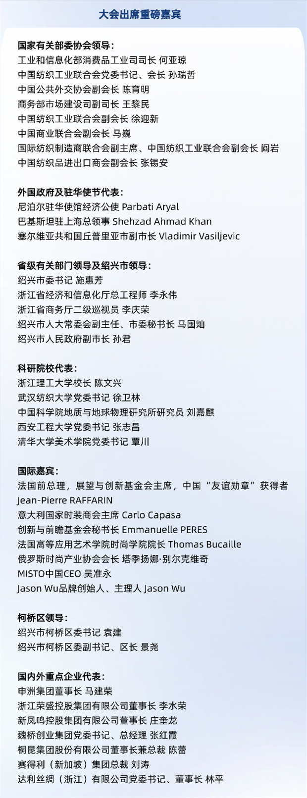 “近年来,绍兴不断厚植‘产业+市场+科创’核心优势,着力构建原料端、制造端、贸易端、服务端一体贯通的现代纺织生态。”施惠芳在致辞中表示,绍兴将把纺织产业焕新升级摆在更加重要的位置,深刻把握全球纺织价值链多维重构的重大机遇,坚持科技、数字、文化、绿色、市场、共富多维度赋能,依托创新平台攻关核心技术,运用智能制造赋能全产业链,完善绿色标准体系,整合全球资源,全力打造纺织共享经济、共富经济。