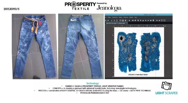 下图为北江纺织2015年10月上海展会和Jeanologia联合打造的LightSensitive系列,完全利用镭射激光和臭氧技术打造出虚拟的竹节风格和经典的磨白和做旧效果。