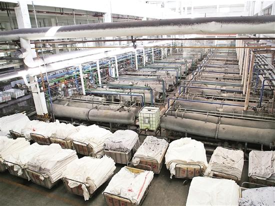 位于柯桥印染集聚区的浙江维艺实业股份有限公司车间内,溢流缸正在加工布匹。公司采用高温高压低浴比溢流作为主要染色设备,专业加工各类中高档纯棉、麻、涤棉的染色及后整理,年产3亿米。近年来,维艺不断升级设备提升产品品质,除印染设备,还更新ERP系统和物联网系统,提升效率,把制造变成“智造”。