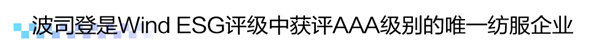 纺织服装业是全球碳排放的重要来源之一,占全球碳排放总量的10%。在这一资源消耗与环境影响显著的行业中,波司登以AAA评级展现了中国企业推动绿色转型的决心与领导力。波司登创始人、波司登集团董事局主席兼总裁高德康表示,ESG是企业面向未来的必答题。波司登将秉持可持续发展理念,不断探索创新,推动绿色技术应用,优化资源利用,助力我国 “双碳” 目标和联合国可持续发展目标(SDGs)的实现。同时,与全价值链的伙伴们携手共进,以责任重塑品牌力,推动行业绿色转型,为社会、环境及利益相关方创造长期价值,为全球可持续时尚贡献中国方案。
