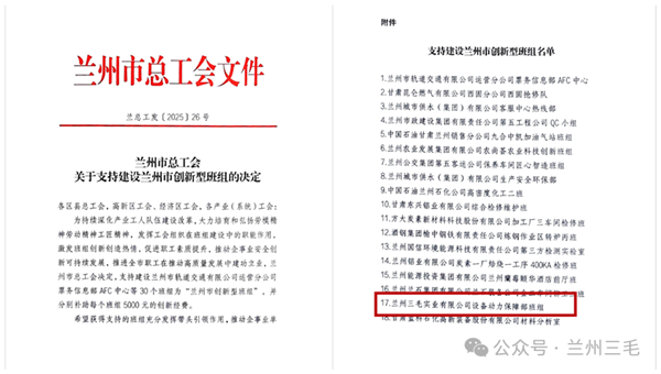 近日,兰州市总工会发布《关于支持建设兰州市创新型班组的决定》,中纺企协常务理事单位兰州三毛实业有限公司设备动力保障部班组凭借在技术创新、人才培养、绿色发展领域的卓越表现,成功入选“兰州市创新型班组”名单,获5000元创新经费支持,树立全市产业工人队伍建设改革与班组创新发展的标杆典范。