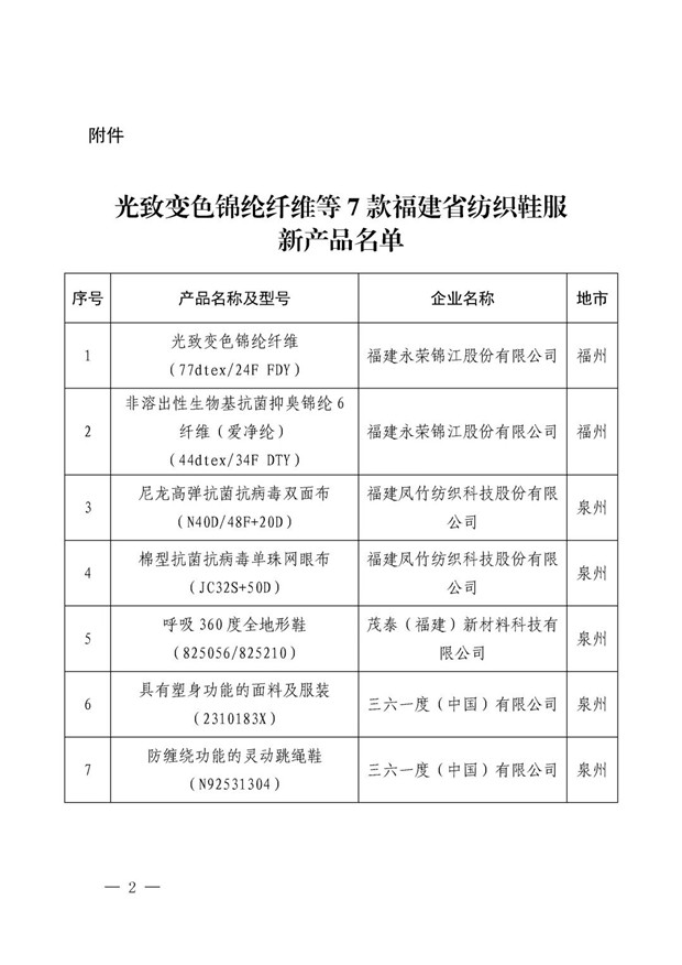 近日,福建省工业和信息化厅依据《关于常态化开展2025年纺织鞋服新产品征集工作的通知》(闽工信函消费〔2025〕207号)要求,经组织征集与严格评审,正式确定光致变色锦纶纤维等7款产品为福建省纺织鞋服新产品,其中福建凤竹纺织两款面料进入名单(名单见下方)。 此次新品公布,不仅是对企业创新能力的认可,更旨在搭建供需对接桥梁。通知明确提出,希望各地及相关单位加强新产品宣传推广,通过推动产销联动、助力品牌拓展,进一步提升这些创新产品的市场知晓度与行业影响力,助力福建纺织鞋服产业在“增品种、提品质、创品牌”的道路上持续迈进。 通知原文: