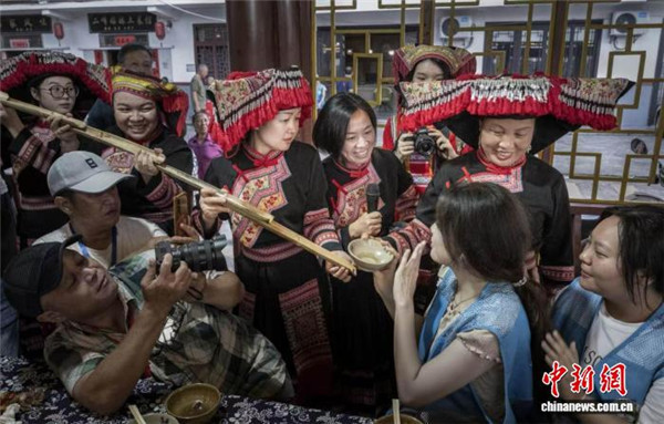 在赵春梅看来,瑶族文化是深山的根与魂,也是瑶乡人走向未来的底气。 这份底气,不能只停留在记忆里。2025年暑假,赵春梅和乡亲们决定做一件事:把在山外读书的孩子们,召回村里,学习瑶歌、长鼓舞等传统文化。 “第一届民族文化暑期培训班上,50多个在外读书的孩子回来了。”赵春梅回忆说,七天培训结束,孩子们登台汇演,稚嫩的瑶歌回荡在山谷中。“他们学会了瑶歌、长鼓舞,还认得了瑶绣的花样。那种种子发芽的感觉,让我觉得这事值得。”赵春梅说,今年计划将培训班继续办下去。 如果说文化传承是情怀,那么让乡亲们靠着文化过上好日子,则是必须面对的问题。 二峰村找到的答案是“长桌宴”。这是瑶族待客的最高礼仪,几十张桌子连成一串,摆满腊肉、糍粑、油茶等地方美食。赵春梅努力把它从民俗变成可以体验、消费的产品,让长桌宴一桌桌摆起来,一笔笔订单落地。