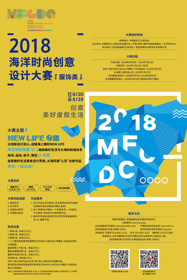 2018海洋时尚创意设计大赛(服饰类)由中国纺织工业联合会指导;中国纺织工业联合会流通分会,中国(青岛)国际时装周组委会,东方时尚中心主办;《纺织服装周刊》杂志社,青岛秀域时尚海洋文化有限公司承办。 本届大赛以“NEW LIFE @海”为主题,即日起正式面向全国征稿,欢迎所有热爱设计、热爱海洋时尚与滨海生活方式的设计人才一起“挥洒”创意与灵感。
