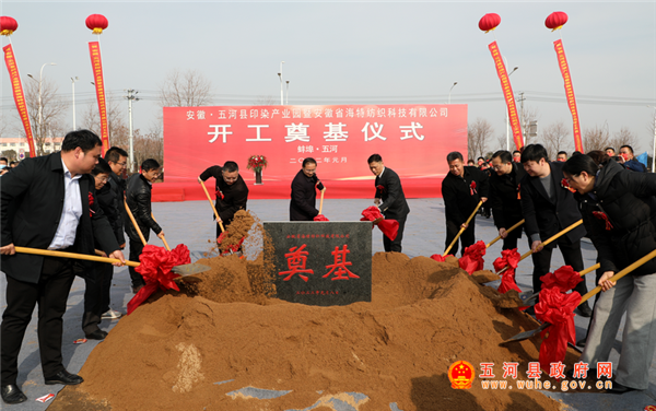 1月8日上午,五河县印染产业园暨安徽省海特纺织科技有限公司项目在城南工业园区举行开工奠基仪式,县委书记金胜庆出席仪式并宣布开工,县委副书记、县长刘中原致辞,县委副书记张斌主持仪式,陶振银、张允武、安琪、孙明恒、凌应琴及江苏海特服饰有限公司董事长朱海荣共同出席开工奠基仪式。