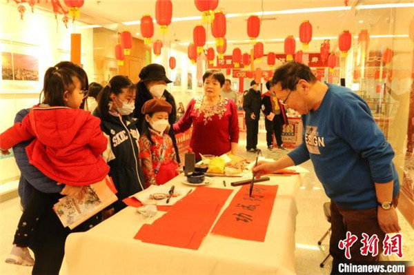 图为书法家为群众书写吉祥寄语 。 崔景圣 摄 5日,中国传统节日“元宵节”来临之际,天津开展多项节日活动丰富群众生活。传统文化“非遗”市集、青少年汉服秀等展出吸引了各个年龄段群众纷纷打卡分享、驻足体验,近距离感受传统节日的氛围。
