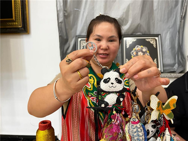 同江市非物质文化遗产展示馆内,赫哲鱼皮匠人展示由她制作的大熊猫鱼皮挂饰。新华社记者 杨轩 摄 随着时代的发展,赫哲族人的鱼皮制作技艺不再是单纯服务于打渔捕猎的生产生活方式,而是成为了珍贵的非物质文化遗产,由新一代的赫哲族人继承发展,并赋予新的载体。 在同江市非物质文化遗产展示馆的二楼,布置了专门体验鱼皮制作技艺的开放式工坊,不少游人前来体验,跟着同江当地的非遗传承人学习传统工艺,亲手将鱼皮裁剪缝制成自己喜爱的形象。通过这种形式,更多的人了解到独特的鱼皮制作技艺和古老的赫哲族,非遗文化也焕发出新的现代活力。 在展示馆二楼活态展示区,赫哲族演员头戴鹿角帽,身穿民族服装,跳起热烈的“温吉尼”舞蹈,为前来参观的游客带来一场神秘又震撼的视听盛宴。表演结束后,游客还可以走上舞台,和演员们学习萨满舞的舞蹈动作,体验赫哲族古老的文化。