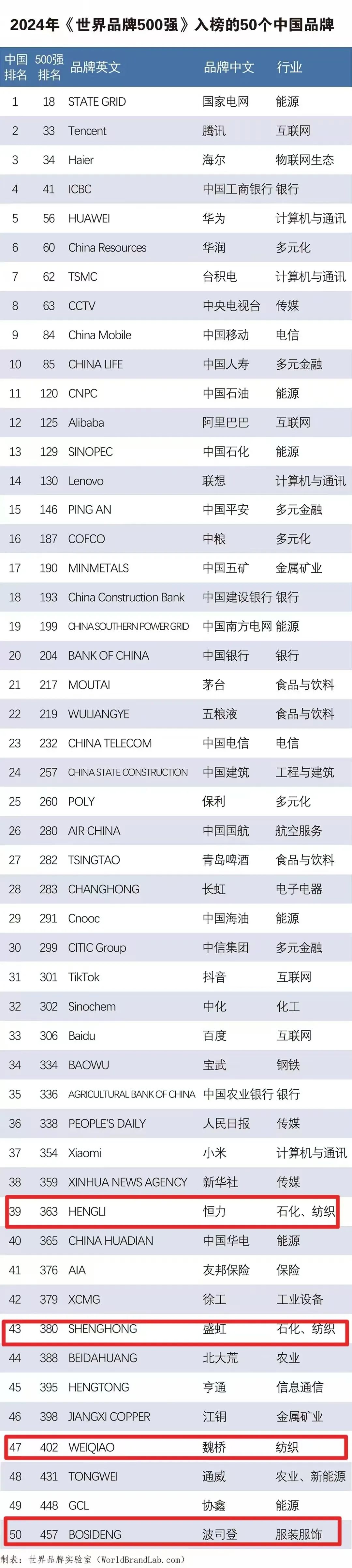 据了解,《世界品牌500强》由世界品牌实验室(World Brand Lab)编制,今年是连续第21年发布,评判依据是品牌的世界影响力,按照市场占有率、品牌忠诚度和全球领导力三项关键指标,对全球知名品牌进行了综合评分,最终推出了世界最具影响力的500个品牌。今年,中国品牌入选数50个,稳居全球第三。其中表现亮眼的品牌有国家电网、腾讯、海尔、华润、中国人寿、五粮液等。纺织行业中, 恒力品牌位列第363位,连续七年入选该榜单; 盛虹品牌位列第380位,较去年提升3位;魏桥位列第402位,比去年排名上升了20位;波司登品牌持续向新攀高,位列第457名,排名攀升5位。