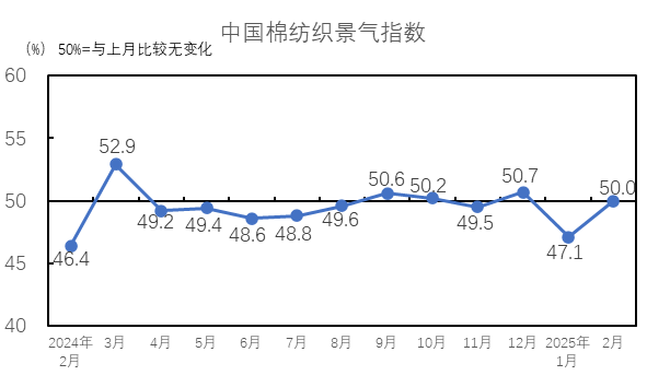 全球制造业稳健复苏。根据中国物流与采购联合会公布的全球制造业采购经理指数,2025年2月份全球制造业PMI为50%,与上月持平,全球经济继续保持稳健复苏态势,内生韧性有所显现。 中国经济景气水平总体回升。国家统计局服务业调查中心和中国物流与采购联合会发布的2025年2月份中国制造业采购经理指数为50.2%,较上月上升1.1个百分点,重返扩张区间。随着春节后企业陆续复工复产,生产经营活动加快,制造业采购经理指数明显回升,我国经济景气水平总体有所回升。 中国棉纺织景气指数回升至荣枯线。2月份中国棉纺织景气指数为50%,处于临界点,较1月上升2.9个百分点。2月份,春节过后纺织企业复工复产顺利,生产销售逐步恢复正常,整体经营情况有所改善,景气指数回升至荣枯线。从分项指数看,构成中国棉纺织景气指数的7个分项指数中,原料采购指数、原料库存指数、生产指数低于临界点,其余指数均高于临界点。7个分项指数中原料库存指数较1月出现下降,其余指数较1月出现上升。