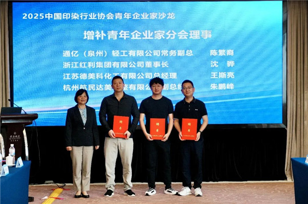 会上,通亿(泉州)轻工有限公司常务副总陈繁裔、浙江红利集团有限公司董事长沈骅、江苏德美科化工有限公司总经理王斯亮、杭州航民达美染整有限公司副总经理朱鹏峰4位同志增补为中国印染行业协会青年企业家分会理事,中国印染行业协会会长林琳为新增补理事颁发聘书。 (来源:中国印染行业协会) 声明:凡于本网文章前标有“CTEI网讯”之文章即表示为本网原创、编译、第一信息源、第一媒体合作方等,如需转载请务必标注文章来源自“中国纺织经济信息网 www.ctei.cn”,本网保留法律权利。
