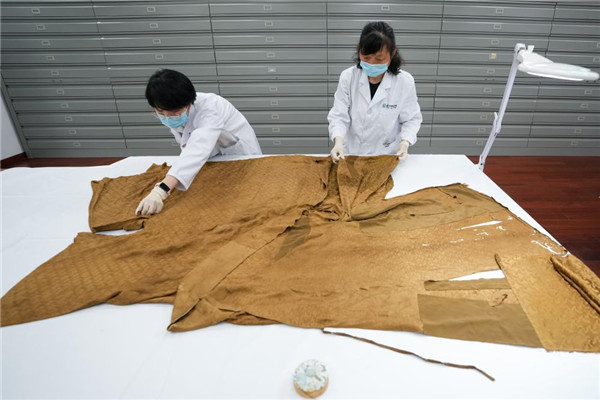 在苏州丝绸博物馆,工作人员介绍多年前修复的一件文物(5月18日摄)。新华社记者 陈朔 摄