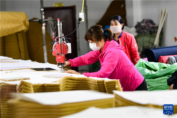 7月2日,工人在化德县服装创业园一服装生产企业车间裁剪絮片。