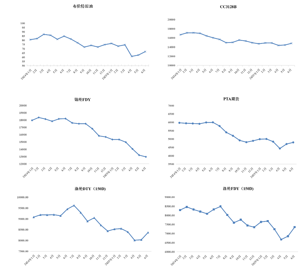 ![]() 图1 2024年1月~2025年6月我国化纤长丝、棉花、PTA期货及布伦特原油价格走势