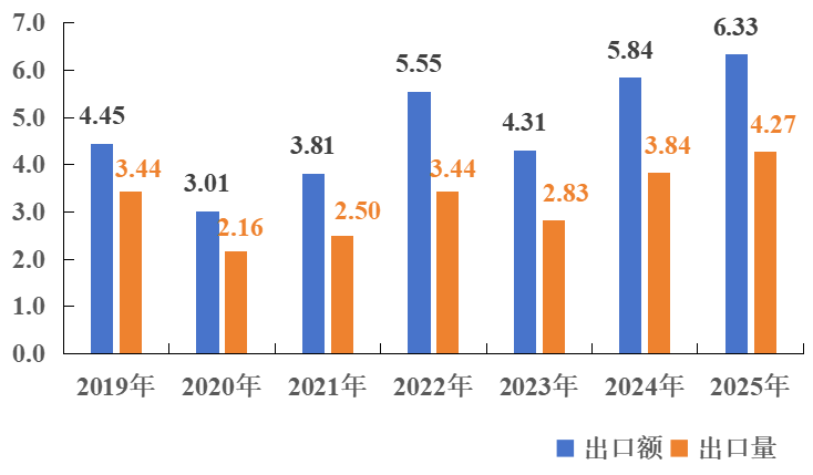 ![]() 图2 我国锦纶长丝织物2019年~2025年1~6月同期出口量额(亿米/亿美元)