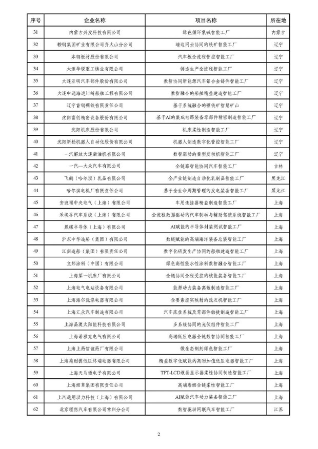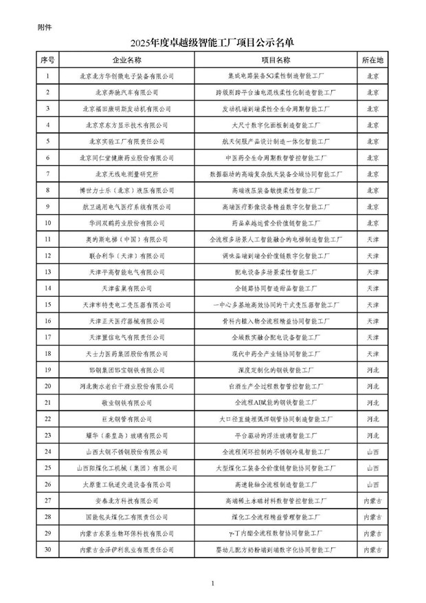 根据《关于开展2025年度智能工厂梯度培育行动的通知》(工信厅联通装函〔2025〕251号),现将拟入选的2025年度卓越级智能工厂项目名单进行公示,请社会各界监督。如有异议,请在公示期内将书面意见反馈至工业和信息化部装备工业一司(智能制造处)。