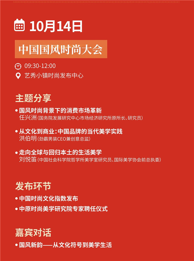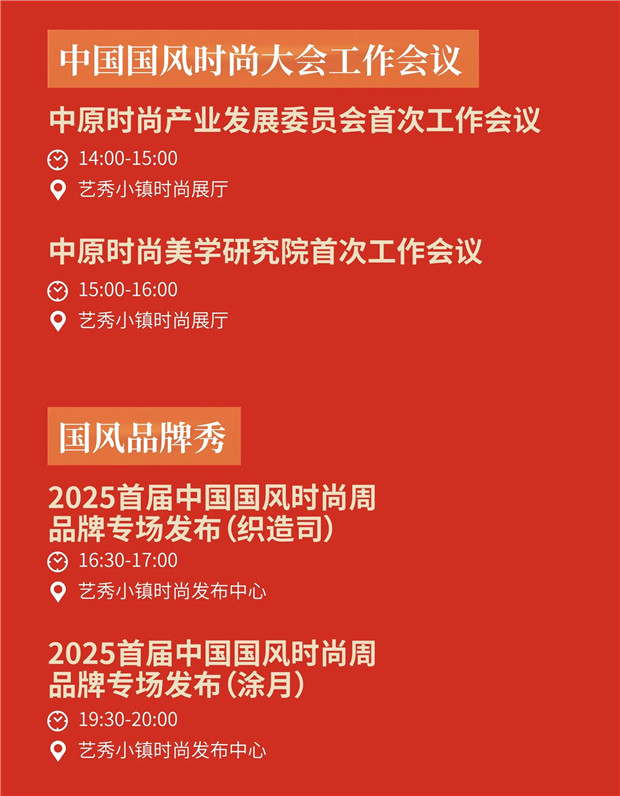 高规格会议2025首届中国国风时尚大会,聚焦国风时尚的文化价值与商业潜力,从区域发展战略、市场观察、品牌实践到美学理论,多维推动国风时尚产业升级,助力中国时尚文化的话语权建设与软实力提升。主题分享环节汇聚权威专家与行业领军人物,发布环节将正式发布“中国时尚文化指数”,举行中原时尚美学研究院专家聘任仪式,彰显产学研协同与区域发展的价值共创与深度融合。嘉宾对话环节以“国风新韵——从文化符号到美学生活”为主题,深入探讨如何将传统文化符号转化为当代美学生活方式,为国风时尚的创新发展注入新动能。 中原时尚产业发展委员会首次工作会议、中原时尚美学研究院首次工作会议、中原时尚美学研究院“大师课”也将相继展开,深度挖掘并结合中原深厚的在地文化底蕴,聚焦产业规划与资源整合,构建具有中原特色的时尚产业链,开辟以文化驱动产业创新的崭新路径。 立足中原文化厚土,国风新潮在此汇聚成势。10月13日—15日,2025首届中国国风时尚周必将成为一场见证东方美学复兴、激发文化自信的盛会,期待与您共赴这场传统与现代交织的时尚之约!