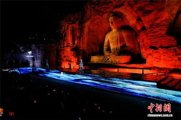 “云冈时装节”29日晚在山西大同云冈石窟20窟前广场启幕。当可随体温变色的智能面料遇上北魏服饰“褒衣博带”的千年形制,一场传统与未来的时尚对话就此展开。
