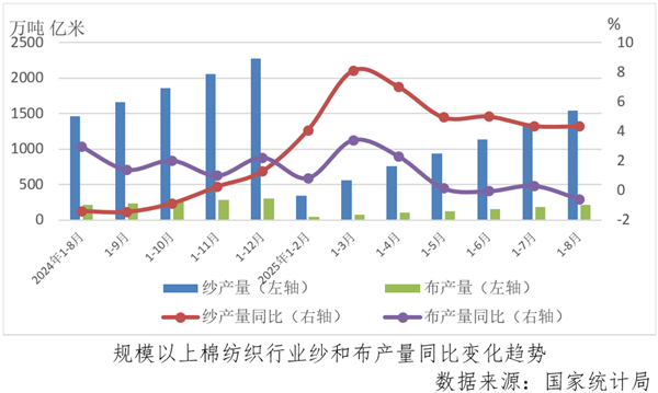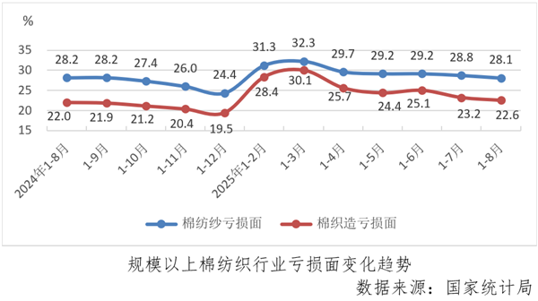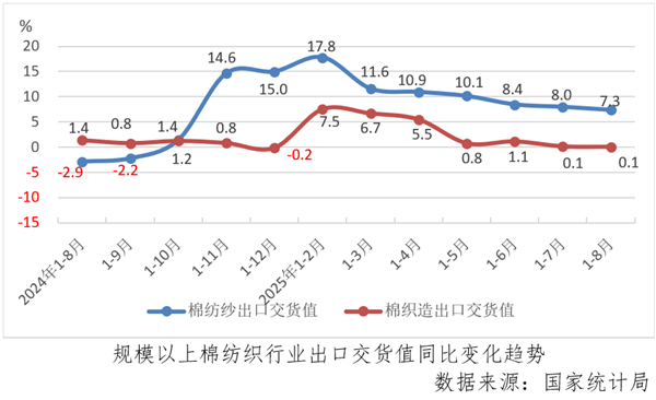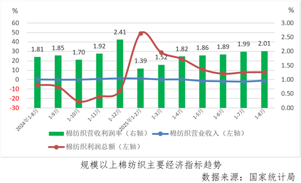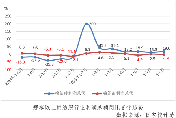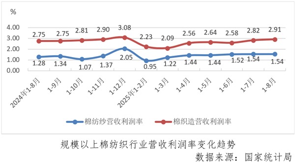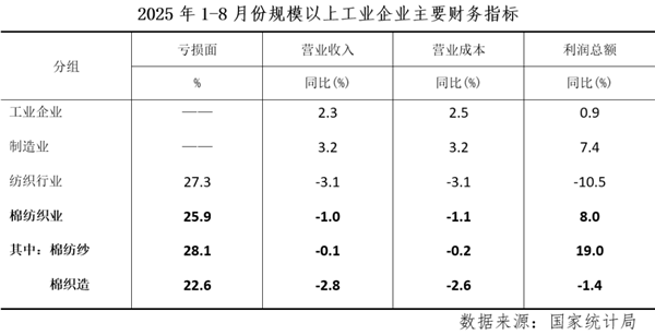 一、棉纺织业——营收降利润增,利润率升至年内新高 据国家统计局1-8月份数据,规模以上棉纺织营业收入同比下降1.0%,降幅较上月累计收缩1.1个百分点,利润总额同比增长8.0%,增速较上月累计扩大0.2个百分点,规上棉纺织营业收入利润率为2.01%,较上月累计扩大0.02个百分点,回升至本年度最高点,首次站上“2”字头。 1-8月份数据显示,与工业、制造业营业收入和营业成本均为正增长相比,棉纺织业两项指标均为下降,但降幅低于纺织行业,在较低基数下,棉纺织的利润总额实现较高增速,分别高出工业和制造业7.1和0.6个百分点,与制造业利润增速接近,而同期纺织行业利润大幅下降10.5%;棉纺织的亏损面整体低于纺织行业,但棉纺纱仍然较高,棉纺纱和棉织造的分化仍在延续。 1-8月份数据显示,棉纺织的营业收入利润率低于工业、制造业和纺织行业,其中棉织造的利润率相对较好,仅低于纺织行业0.09个百分点,棉纺纱对整个棉纺织的利润率拖累较大。1-8月份,棉纺织的产成品库存周转天数为38.5天,较上月累计降低0.2天,其中棉纺纱降低0.5天,棉织造扩大0.7天;棉纺织的应收账款平均回收期为45.3天,较上月累计降低0.8天,其中棉纺纱降低1.7天,棉织造扩大1.2天。 (一)营业收入——棉纺纱和棉织造增速均延续下降趋势 1-8月份,规模以上棉纺织营业收入同比下降1.0%,已连续4个月累计同比下降,但降幅较上月累计收缩1.1个百分点,其中棉纺纱和棉织造下降幅度分别为0.1%和2.8%,棉纺纱降幅较上月收缩1.6个百分点,棉织造降幅与上月持平。 (二)利润总额——棉纺纱增速扩大,棉织造增速由升转降 1-8月份,规模以上棉纺织利润总额同比增长8.0%,增速较1-7月份扩大0.2个百分点,其中棉纺纱利润总额增速为19.0%,较上月累计扩大5.7个百分点,棉织造利润总额同比下降1.4%,由上月累计增长转为下降。 (三)营业收入利润率——棉纺纱和棉织造均达年内最高点 1-8月份,规模以上棉纺织营业收入利润率为2.01%,较1-7月份扩大0.02个百分点,其中棉纺纱和棉织造利润率分别为1.54%和2.91%,棉纺纱增速和上月累计持平,棉织造增速较上月累计扩大0.08个百分点。 (四)亏损面——棉纺纱和棉织造均降至年内最低点 1-8月份,规模以上棉纺织亏损面为25.9%,较1-7月份收缩0.7个百分点,其中棉纺纱和棉织造亏损面分别为28.1%和22.6%,较1-7月份分别收缩0.6和0.7个百分点,棉纺纱和棉织造亏损面均降至年内最低点。 (五)出口交货值——棉纺纱和棉织造增速均降至年内最低 1-8月份,规模以上棉纺织出口交货值同比增长2.3%,较1-7月份增速回落0.3个百分点,增速降至年内最低点,其中棉纺纱增速为7.3%,较上月累计回落0.6个百分点,棉织造增速为0.1%,较上月累计回落0.1个百分点。 (六)产品产量——纱产量增速放缓,布产量同比下降 1-8月份,规模以上纱产量为1542.7万吨,同比增长4.34%,增速较1-7月份回落0.03个百分点,仅高于1-2月份累计;规模以上布产量为210.5亿米,同比下降0.57%,从上月累计增长转为下降。 二、运行展望 8月1日,国家有关主管部门联合发文要求新疆压减已申报棉纺项目,暂停新项目申报。1-8月份数据显示,规模以上棉纺纱和棉织造的利润率升至年内最高,亏损面降至年内最低,且亏损面低于整个纺织行业,棉纺织领域“反内卷”取得积极成效。下一步,行业应积极响应并践行《共促中国棉纺织行业高质量发展倡议书》,推动行业进一步把握宏观政策,发展新质生产力,深化产业转型升级,推动高质量发展,同时强化行业自律,防止“内卷式”恶性竞争。 据中国棉花协会调查:2025/26年度全国棉花总产量预计721.6万吨,同比增长8.3%,为2012/22棉花年度以来新高。国庆前后,新花陆续上市,在行业整体原料库存偏低的情况下,企业应密切关注原料价格及产销走势,控制好采购及库存结构,有能力和条件的企业,利用好金融工具,做好套期保值和风险控制,保障资金链安全。 (来源:中棉行协) 声明:凡于本网文章前标有“CTEI网讯”之文章即表示为本网原创、编译、第一信息源、第一媒体合作方等,如需转载请务必标注文章来源自“中国纺织经济信息网 www.ctei.cn”,本网保留法律权利。