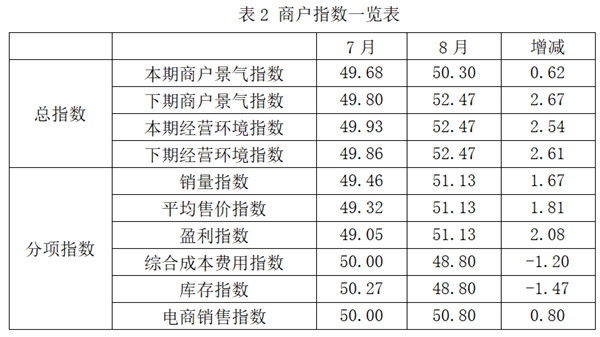 数据显示,管理者方面,下期管理者景气指数为55.16,较上期上升0.64个百分点;下期经营环境指数为54.52,较上期上升0.65个百分点。商户方面,下期商户景气指数为53.85,较上期上升1.38个百分点;下期经营环境指数为53.71,较上期上升1.24个百分点。