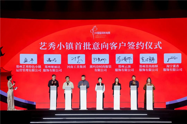 开幕式上,中原时尚产业发展委员会、中原时尚美学研究院两大平台同步揭牌,中牟新区艺秀小镇推进委员会正式成立。中国纺织工业联合会副会长、中国服装协会会长陈大鹏及相关领导为中原时尚产业发展委员会、中原时尚美学研究院授牌。三大平台的建立,将进一步提升国风品牌创新能力,增强产品文化底蕴,推动设计、制造、营销全链条协同发展。 随后举行的艺秀小镇首批意向客户签约仪式中,郑州艺秀特色小镇运营管理有限公司、郑州娅丽达服饰有限公司、河南工美集团、黛玛诗时尚服装有限公司、郑州云顶服饰有限公司、郑州首尚格释服饰有限公司、海宁薰香服饰有限公司代表上台,共同见证了“穿国风,到艺秀”从愿景走向现实的关键一步。这些企业的入驻,将为国风产业生态注入新的活力。