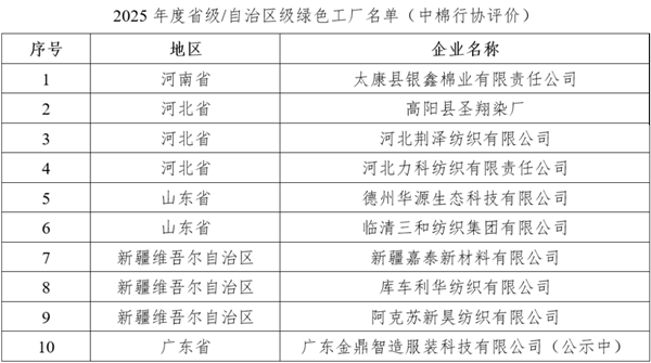 为全面加强绿色制造体系建设,强化绿色制造单位梯度培育,今年以来,全国各地区工信部门组织开展了2025年度省级/自治区级绿色制造单位推荐工作,并于近期陆续发布了绿色制造单位名单。其中,中国棉纺织行业协会(以下简称“中棉行协”)受托评价的10家企业成功创建为省级/自治区级绿色工厂。