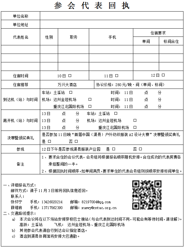 1.本次会议不收会议费、资料费、餐饮费;交通、住宿费自理。为深入贯彻党中央、国务院关于促进数字经济与实体经济深度融合发展的战略部署,利用人工智能技术推动传统产业的转型升级,通过AI技术与产业深度融合,促进户外纺织服装产业的高质量发展,现定于2025年11月12日在四川渠县召开“2025中国(渠县)户外纺织服装AI创新发展大会”。会议将重点介绍户外纺织服装产业发展现状、趋势,以及人工智能技术在纺织服装产业的深度应用。 会议主要内容和有关事宜通知如下: 2.会务组11日将在达州金垭机场、重庆江北国际机场、高铁土溪站安排接机(站),13日在以上三个机(站)安排送机(站)。需接送的参会代表填写参会代表回执时,请填写到达和离开时间;其他参会代表请自行到达会议指定酒店。酒店到会场将安排通勤大巴。 3.报名方式(二选一): (1)填写参会代表回执,请于11月3日前将回执信息返回。