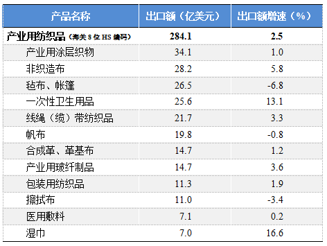数据来源:国家统计局,中国产业用纺织品行业协会 国际贸易方面,根据中国海关数据(海关8位HS编码统计数据),2025年1-8月我国产业用纺织品行业的出口额为284.1亿美元,同比增长2.5%;行业进口额为35.9亿美元,同比增长3.5%。 分产品来看,2025年1-8月,行业最大出口产品产业用涂层织物的出口额为34.1亿美元,同比增长1%;非织造布的出口额位居行业第二,达到28.2亿美元,同比增长5.8%,同期出口量为110.8万吨,同比增长12.2%;毡布/帐篷的出口额为26.5亿美元,同比下降6.8%;一次性卫生用品(尿裤、卫生巾等)的出口额为25.6亿美元,同比增长13.1%;其他重点产品方面,产业用玻纤制品、线绳(缆)带纺织品、包装用纺织品和革基布的出口额分别同比增长3.6%、3.3%、1.9%和1.2%;擦拭类产品方面,擦拭布(不含湿巾)的出口额为11亿美元,同比下降3.4%,湿巾出口额达到7亿美元,同比增长16.6%。 2025年1-8月产业用纺织品行业及主要产品出口情况
