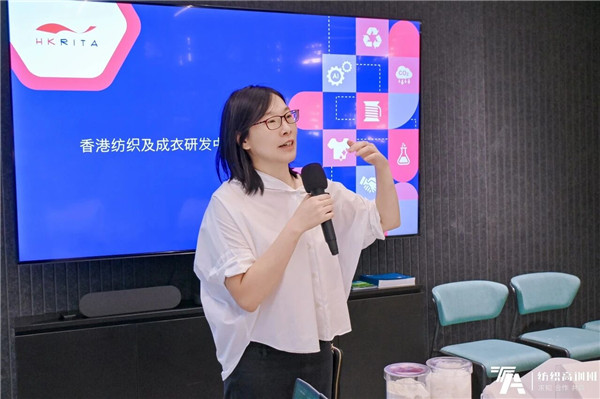 图 | 谢恺宜 香港纺织及成衣研发中心成立于2006年,由香港特别行政区创新科技署拨款,并由香港理工大学承办。据香港纺织及成衣研发中心项目设计高级经理谢恺宜介绍,研发中心倡导以技术方案解决纺织行业问题,将研究理念转化为商机并推动业界应用。例如,在可持续发展方面,开发了物料分离技术、绿色材料开发、智能服装分类回收系统、微塑料解决方案等。此外,其通过开研Open Lab这一合作平台,展示解决方案并提供解决问题的资源,以推进时尚产业可持续发展。