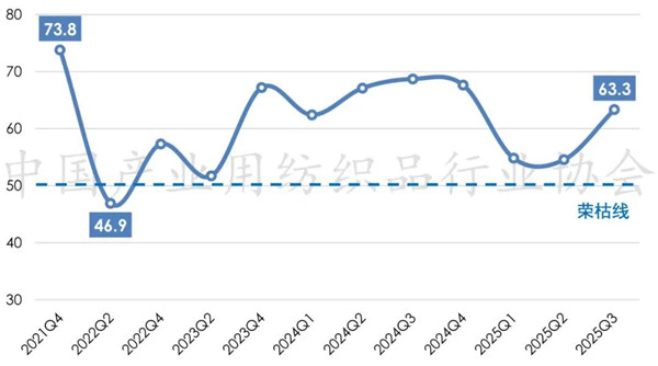 2025年前三季度,全球经济复苏乏力、地缘政治冲突持续、主要经济体货币政策不确定性犹存;我国经济运行保持稳中有进态势,高质量发展取得积极成效。面对复杂严峻的外部环境,我国产业用纺织品行业经济运行总体保持平稳,行业的生产、经济效益指标增速有所放缓,出口呈现温和回暖趋势。根据中国产业用纺织品行业协会调研,2025年前三季度我国产业用纺织品行业景气指数为63.3,较上半年提升8.7个点(图1)。 图1 2021年以来我国产业用纺织品行业景气指数