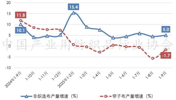 自2025年以来,我国非织造布产量呈现出“高开、回落、趋稳”走势,根据国家统计局数据,2025年1-9月规模以上企业的非织造布产量同比增长5%,月均产量较二季度提升12.2%。帘子布市场需求放缓,产量整体处于负增长区间,1-9月规模以上企业的帘子布产量同比下降1.7%(图2)。 图2 近一年我国非织造布、帘子布产量增速情况(规模以上)