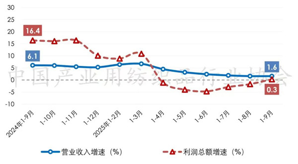 根据国家统计局数据,2025年前三季度产业用纺织品行业规模以上企业的营业收入和利润总额分别同比增长1.6%和0.3%;根据中国产业用纺织品行业协会测算,行业规模以上企业的营业利润率为3.7%,同比下降0.1个百分点;行业亏损面为24.2%,较二季度收窄2.6个百分点。自2025年一季度以来,行业的营业收入增速逐月放缓,利润总额增速再次进入下降通道,行业经济平稳运行的基础仍需巩固。 图3 近一年我国产业用纺织品行业营业收入和利润总额增速情况(规模以上)