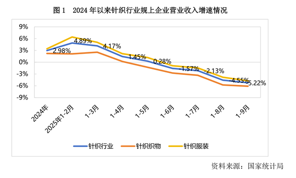 2025年1—9月,我国针织行业在复杂多变的内外环境中展现出较强的发展韧性,虽面临营收与终端产品出口回落的压力,但内销市场稳步复苏、出口新兴市场加速拓展,行业呈现整体稳定和承压前行的运行态势。 01 营收降幅有所扩大,产量占比保持高位 据国家统计局统计,2025年1—9月针织行业规模以上企业营业收入同比下降5.22%;降幅较前期进一步扩大,较1—6月扩大了3.65个百分点。行业营业收入同比增速自今年二季度起开始放缓,并出现负增长。从针织两大类产品的分行业来看,1—9月针织织物规上企业营业收入同比下降6.10%,针织服装规上企业营业收入同比下降4.72%。