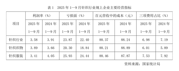 02 效益承压出现分化,织物板块稳健向好 2025年1—9月,针织规模以上企业利润总额同比下降13.2%,降幅较1—6月扩大了2.2个百分点,盈利收缩态势有所加剧。营业收入利润率为3.58%,同比下降0.33个百分点;利润率较纺织行业平均水平高出0.5个百分点,行业盈利能力仍具备相对优势。成本与费用控制保持稳定,每百元营业收入的营业成本为88.37元,三项费用占比为6.98%。行业亏损面较上半年有所收窄,显示部分企业经营状况逐步改善,但亏损企业亏损额同比仍呈上升态势,缺乏核心竞争优势的企业压力进一步加大,行业内企业分化趋势愈发明显。 细分至针织织物与针织服装两大核心板块,二者均面临不同程度的下行压力,但效益表现呈现较大差异。其中,针织织物板块表现相对稳健。1—9月针织织物规上企业利润总额同比下降0.23%;利润率为3.89%,较上年同期提高了0.23个百分点;每百元营业收入中的营业成本为88.21元,同比下降0.68元,盈利水平有所提升。 针织服装板块则受终端市场、出口关税调整及海外需求波动等因素共同作用,效益下滑较为明显。1—9月针织服装规上企业利润总额同比下降19.86%;利润率为3.41%,较上年同期下降0.64个百分点;每百元营业收入中的营业成本为88.46元,同比上升0.59元,盈利能力有所弱化。
