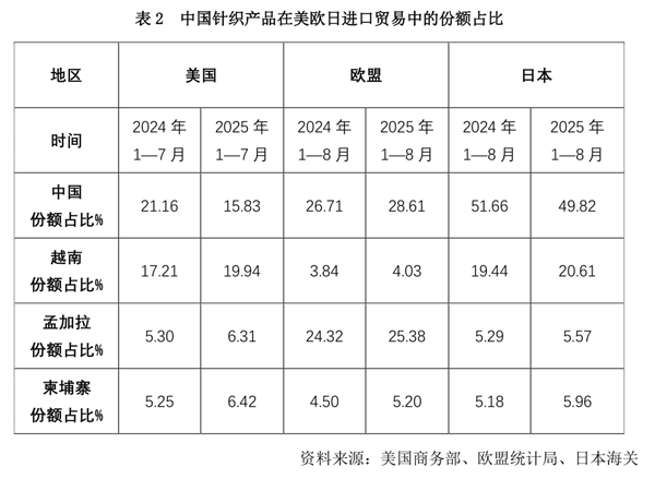 从主要出口市场来看,1—9月我国针织产品对美国出口147.25亿美元,同比下降7.23%。受美国关税政策扰动,订单转移趋势加剧等影响,短期下行压力显著,其中9月当月对美出口同比降幅扩大至16.39%。另据美国商务部数据显示,今年1—7月我国针织产品在美国进口贸易额中的占比为15.83%,较上年同期下降了5.33个百分点;同期,越南、孟加拉国和柬埔寨的份额占比分别提高了2.73、1.01和1.17个百分点,反映出美国市场订单的变化走向。 1—9月对东盟十国出口134.10亿美元,同比下降2.71%,其中针织织物出口同比增长7.36%;对欧盟出口123.98亿美元,同比增长6.97%;对日本出口49.95亿美元,同比增长3.16%。