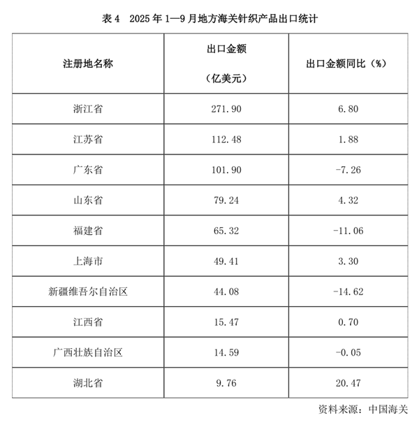从地方海关数据来看,头部出口地区表现不一。1—9月位列针织产品出口前五位的地区中,浙江、江苏、山东情况较好,出口额同比分别增长6.8%、1.88%和4.32%。广东和福建同比分别下降7.26%和11.06%。