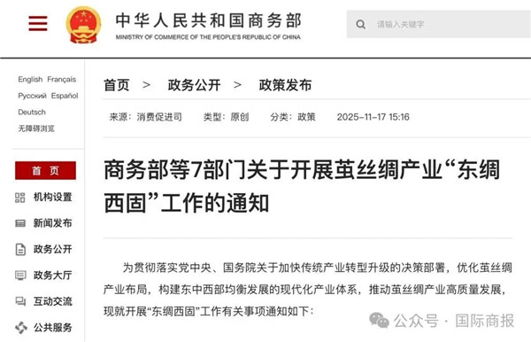 商务部等7部门联合印发的《关于开展茧丝绸产业“东绸西固”工作的通知》于11月17日公布。