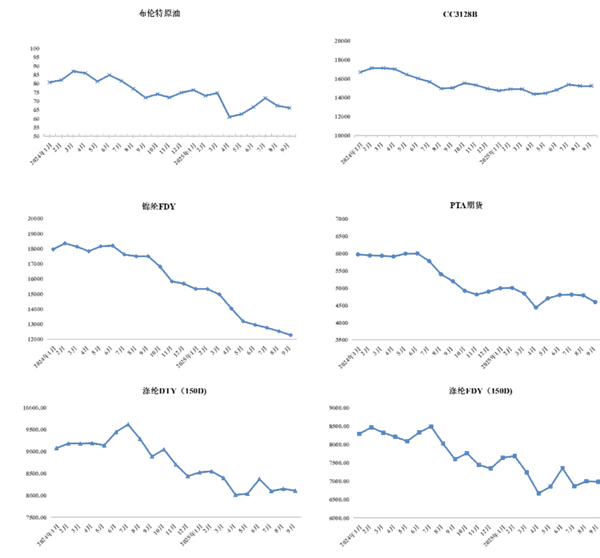 图1 2024年1月~2025年9月我国化纤长丝、棉花、PTA期货及布伦特原油价格走势 单位:美元/桶、元/吨 资料来源:中国长丝织造协会