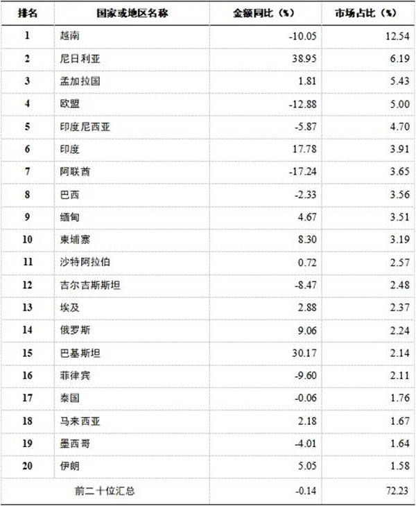 图2 我国锦纶长丝织物2021年~2025年1~9月同期出口量额(亿米/亿美元) 资料来源:中国海关 从化纤长丝织物终端市场制成品出口表现来看,中国海关数据显示,2025年1~9月,长丝机织家用纺织品出口额增长3.2%,化纤长丝机织服装、产业用纺织品出口额分别同比下降2.8%、1.8%,终端家纺制成品出口表现稳健。从终端市场出口占比情况来看,化纤机织制成品在终端市场竞争优势进一步扩大,化纤机织家用、产业用制成品占纺织制成品出口总额比重为40.6%,化纤机织服装占机织服装出口总额比重为60.6%。结合织物出口,化纤长丝机织产品2025年1~9月整体出口贡献超过600亿美元,约占纺织行业总出口额的27.5%。 (2)出口市场情况分析 2025年前三季度,我国化纤长丝织物出口市场呈现总量扩张与结构优化的双重特征,出口市场多元化格局进一步巩固,新兴市场贡献显著提升,展现出行业在国际复杂经贸环境下的强大韧性。 2025年1~9月,我国化纤长丝织物累计出口额超过1亿美元的单一市场有37个,主要出口市场中出口额排名前二十的国家和地区累计出口份额占我国长丝织物出口总额的72.2%。从主要市场来看,共建“一带一路”国家在我国出口市场中占据主导地位且重要性持续提升。2025年1~9月我国对共建“一带一路”国家长丝织物总计出口额同比增长1.3%,占我国长丝织物出口总额的87.1%,占比较去年同期扩大0.7个百分点。在出口额排名前二十的国家和地区中,共建“一带一路”国家占据十七席,其中越南依旧是我国长丝织物第一大出口国,但出口额同比下降10.1%,在我国出口市场所占份额缩减了1.5个百分点。(表1) 表1 2025年1~9月我国化纤长丝织物主要出口市场情况(按出口额排名)