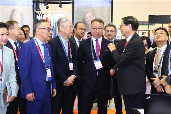 孙瑞哲、Jemmy Kartiwa、Sharon Lim、Jason NG、夏令敏、徐迎新、梁鹏程,FOURSOURCE首席执行官兼联合创始人Jonas Wand,VF公司全球可持续发展、责任、贸易和政府事务副总裁Sean Cady共同为APTEXPO 2025亚太纺织服装供应链博览会剪彩揭幕。 开幕首日,孙瑞哲一行走访了广州速塑、浙江轻纺城展团、唐诗村、宿迁晨风、真维斯、贝德、中哲集团、VSIP、江苏金辰、大连隆生、上海东隆、罗曼罗兰户外新材等展位,和展位负责人交流企业发展情况以及本届展会所展出的特色展品。