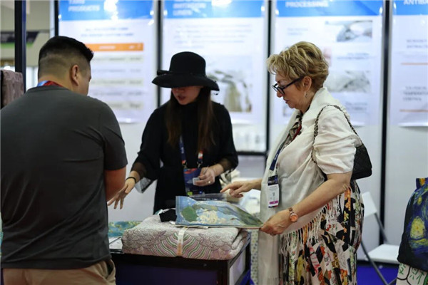 来自广东广州的速塑品牌,主打女性塑形内衣类产品,据介绍其目前在国内已有500多家店铺,产品涵盖塑身衣、文胸、运动及家居服等多个品类,希望通过APTEXPO将供应链及相关渠道拓展拓广,服务于更多愿为悦己消费的女性群体。 来自浙江的唐诗村品牌,向领导及嘉宾一行展示了其主打的汉麻系列产品。其产品一改消费者对汉麻粗糙、挺括的固有印象,推出的“婴儿级汉麻”产品,是与新疆棉混纺,手感细腻、顺滑,更兼具柔软属性,可应用在婴幼儿贴身衣物。